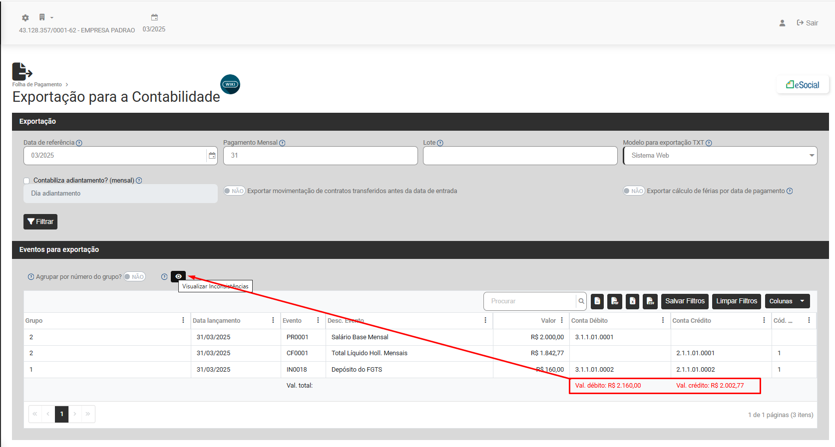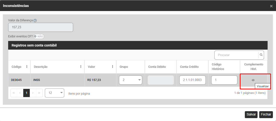 Caso exista diferença entre o total de débito e o total de crédito, a informação será apresentada no rodapé da tela, na cor vermelha, clique em Visualizar Inconsistências