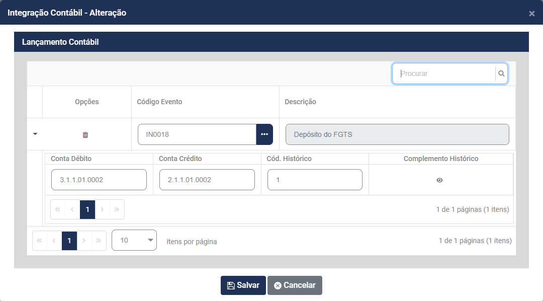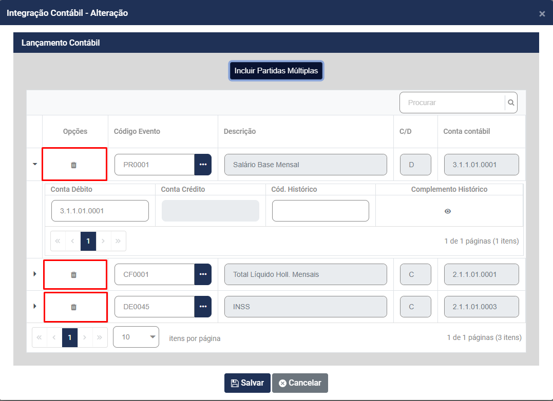 Se houver necessidade de remover um Evento que foi integrado com a Contabilidade, bastará que você clique no botão com o desenho da lixeira, existente na linha do evento que será removido