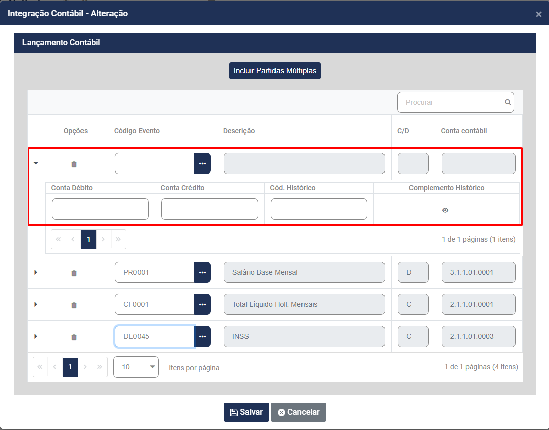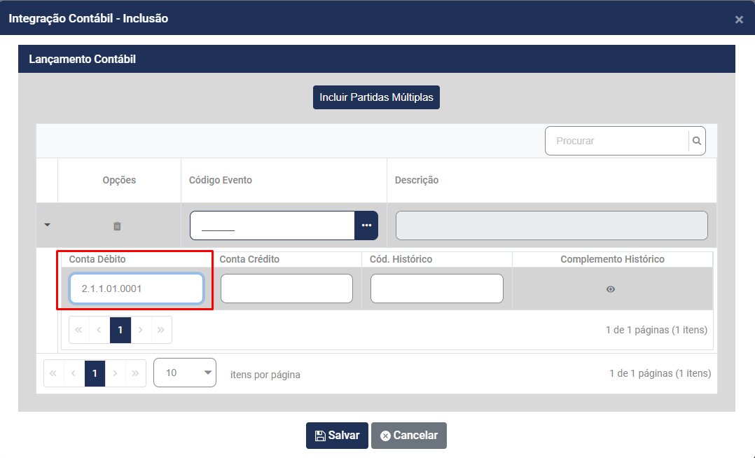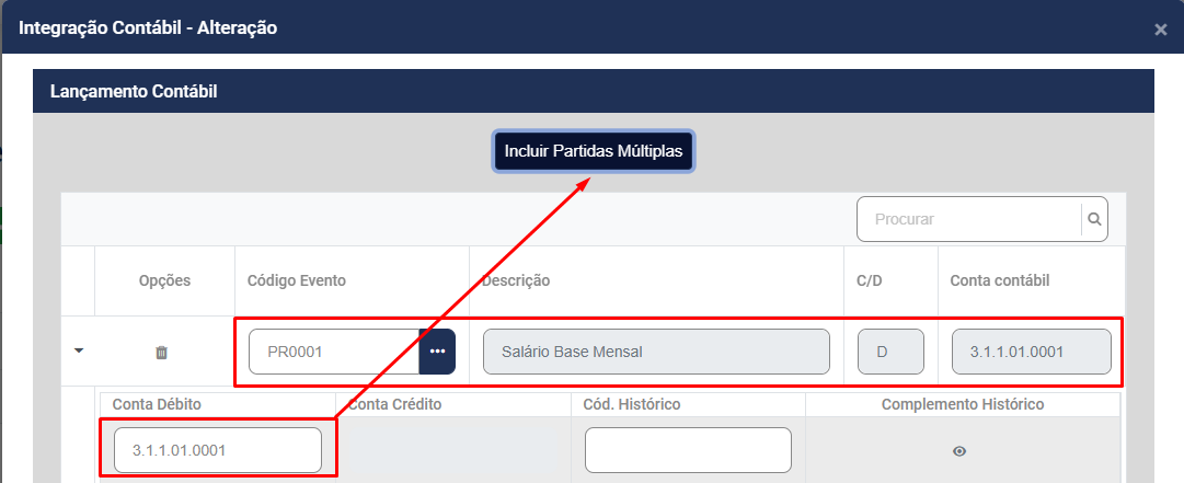 Para utilizar Partida Múltipla você NÃO PODERÁ integrar nenhum evento com Conta de débito e Crédito pois quando definir conta de débito e crédito para um mesmo evento, o Módulo irá desabilitar o botão Incluir Partidas Múltiplas