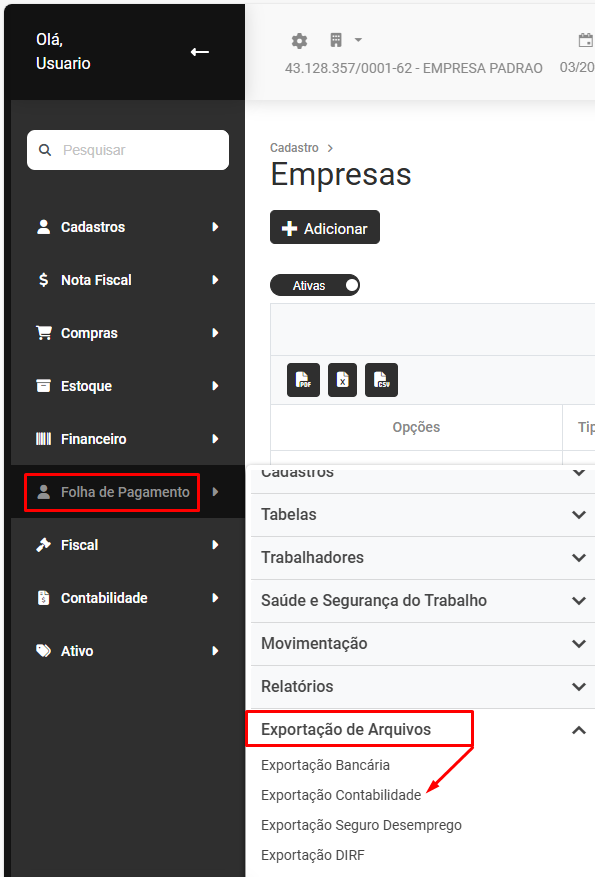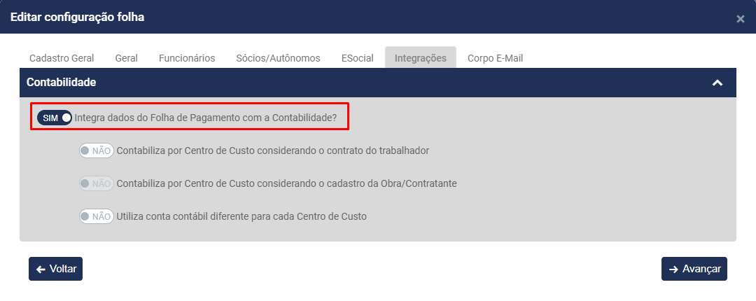 - Folha - Defina Sim para que o Módulo permita a integração com a Contabilidade