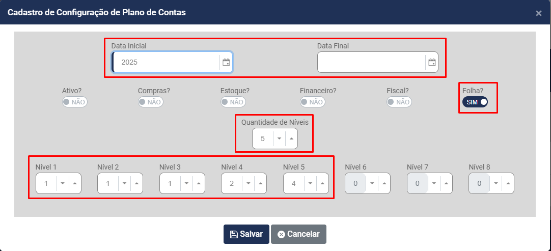 - Quantidade de Níveis - informe quantos níveis possui a Conta Analítica de seu Plano de Contas