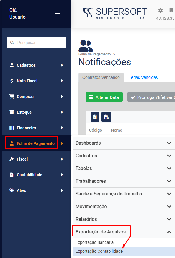 Você conseguirá visualizar os Lançamentos Contábeis que terão origem no Módulo Folha de Pagamento acessando o menu Folha de Pagamento>Exportação de Arquivos>Exportação Contabilidade