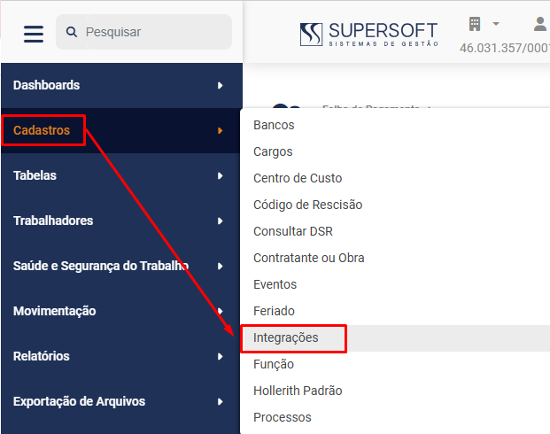 Se nas Configurações do Módulo Folha de Pagamento da Empresa, aba Integrações você definir que irá integrar o Módulo Folha de Pagamento com Livro Caixa ou com a Contabilidade, será habilitado o menu Folha de Pagamento>Cadastros>Integrações