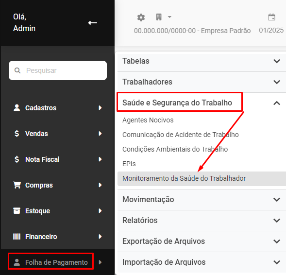Para Cadastrar o Monitoramento da Saúde do Trabalhador você deverá acessar o menu Folha de Pagamento>Saúde e Segurança do Trabalho>Monitoramento da Saúde do Trabalhador