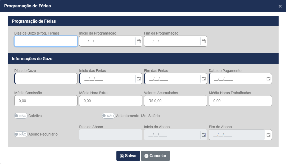 Será apresentada a tela para que você cadastre a Programação de Férias ou Informações de Gozo (campos não obrigatórios)