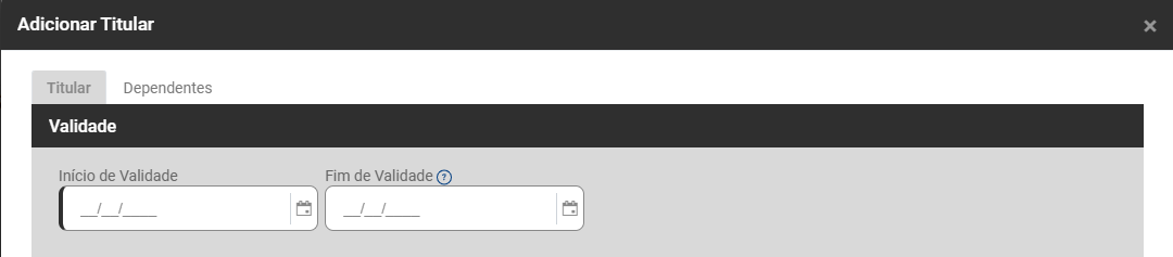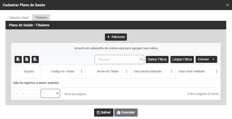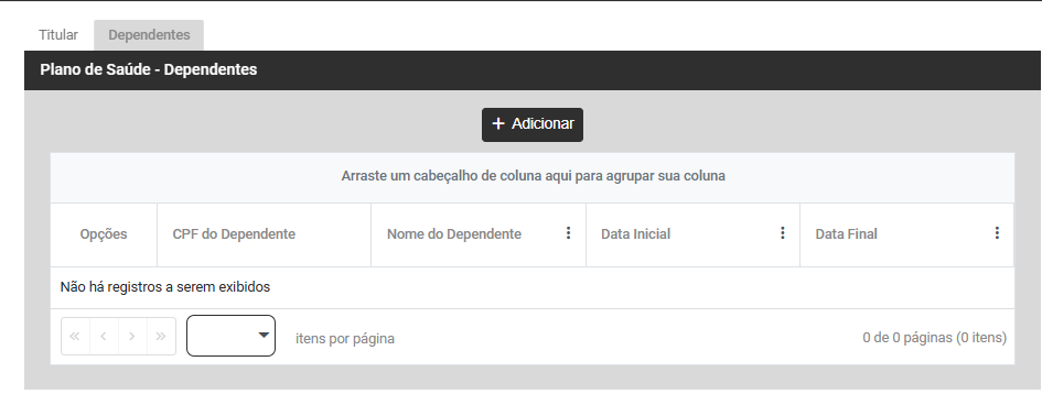 Clique no Botão Adicionar para cadastrar novos Titulares e Dependentes para o Plano de Saúde e o Módulo apresentará a tela com duas Abas (Titular e Dependentes) para que você informe: