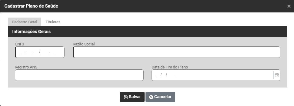 Será apresentada a tela para Cadastrar Plano de Saúde, com duas Abas, Cadastro Geral e Titulares e você deverá definir: