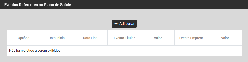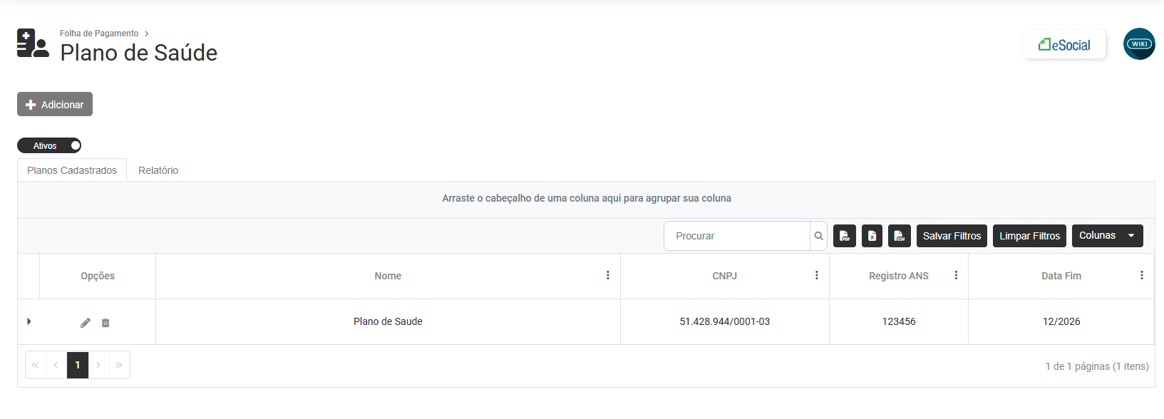Para Adicionar um Novo Plano de Saúde, acesse o botão Adicionar existente na parte superior da tela