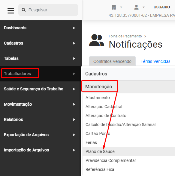 Para Cadastrar os Planos de Saúde de sua Empresa, acesse o menu Trabalhadores>Manutenção>Plano de Saúde