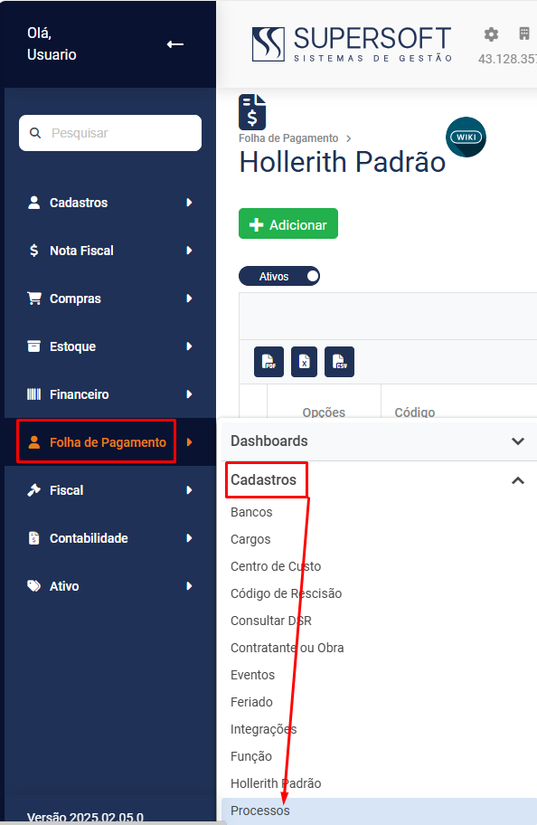 Para cadastrar os Processos da Empresa acesse o menu Folha de Pagamento>Cadastros>Processos