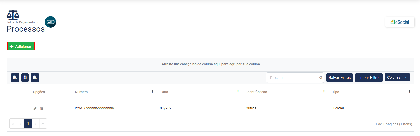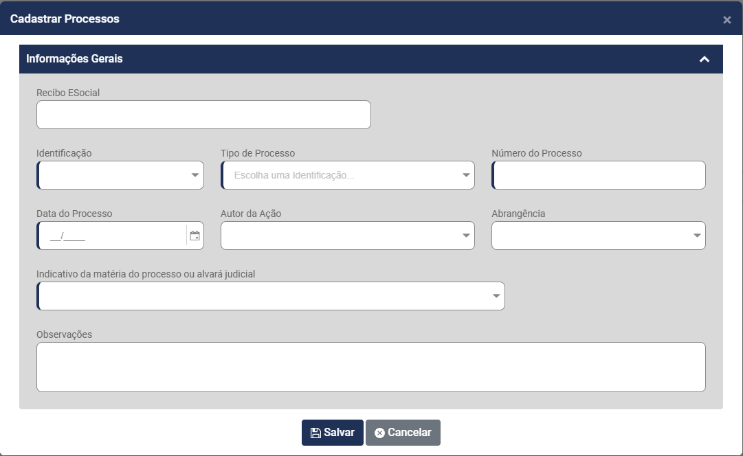 • Recibo do eSocial - esse campo será preenchido apenas se esse processo já estiver informado no Portal do eSocial