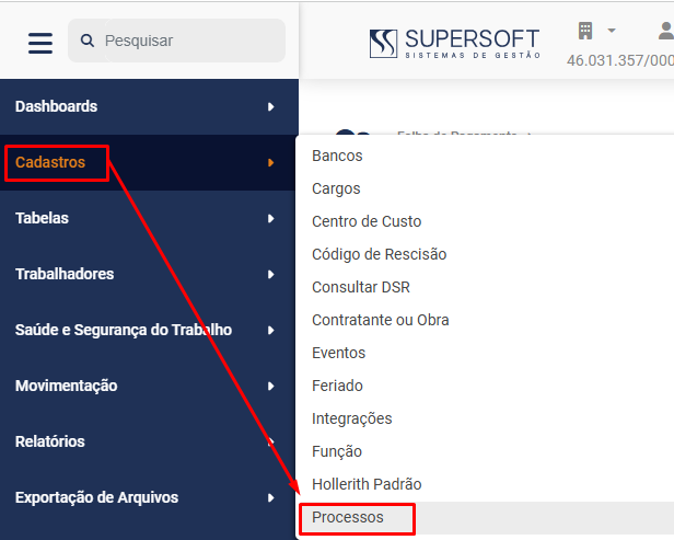 Para cadastrar os Processos da Empresa acesse o menu Folha de Pagamento>Cadastros>Processos