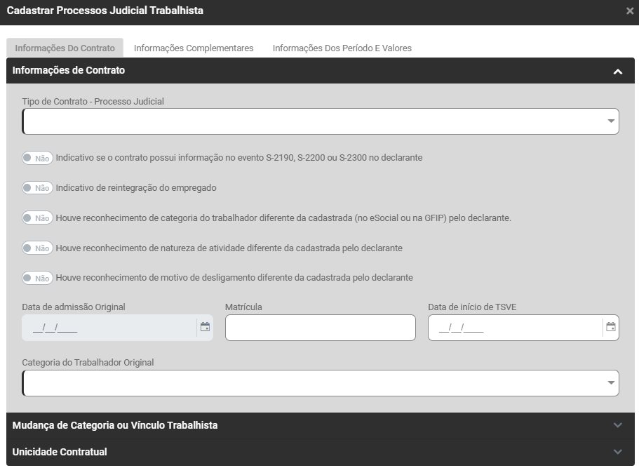 Informe o Tipo de Contrato - Processo Judicial e em seguida defina todas as informações apresentadas na tela