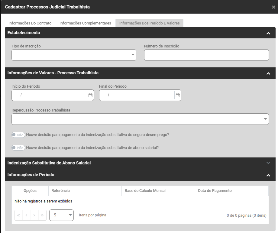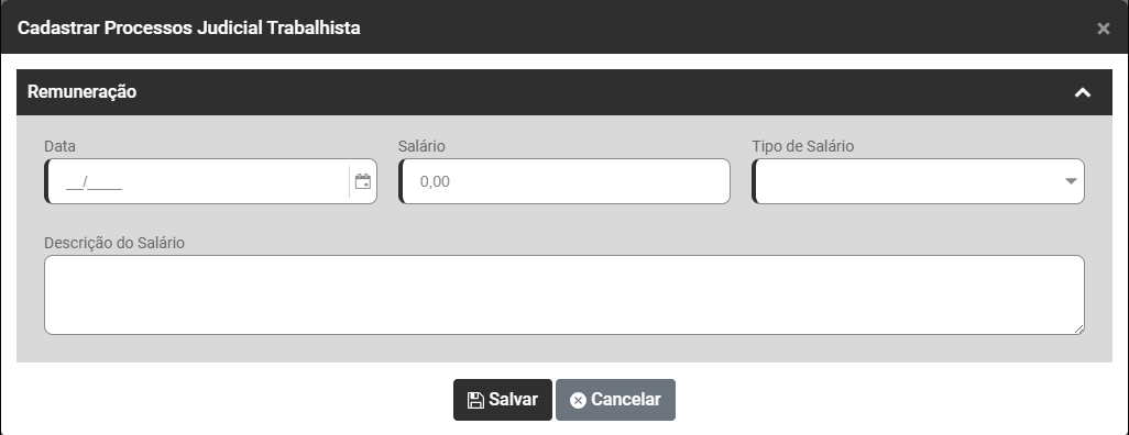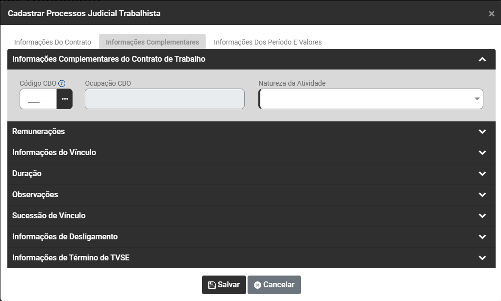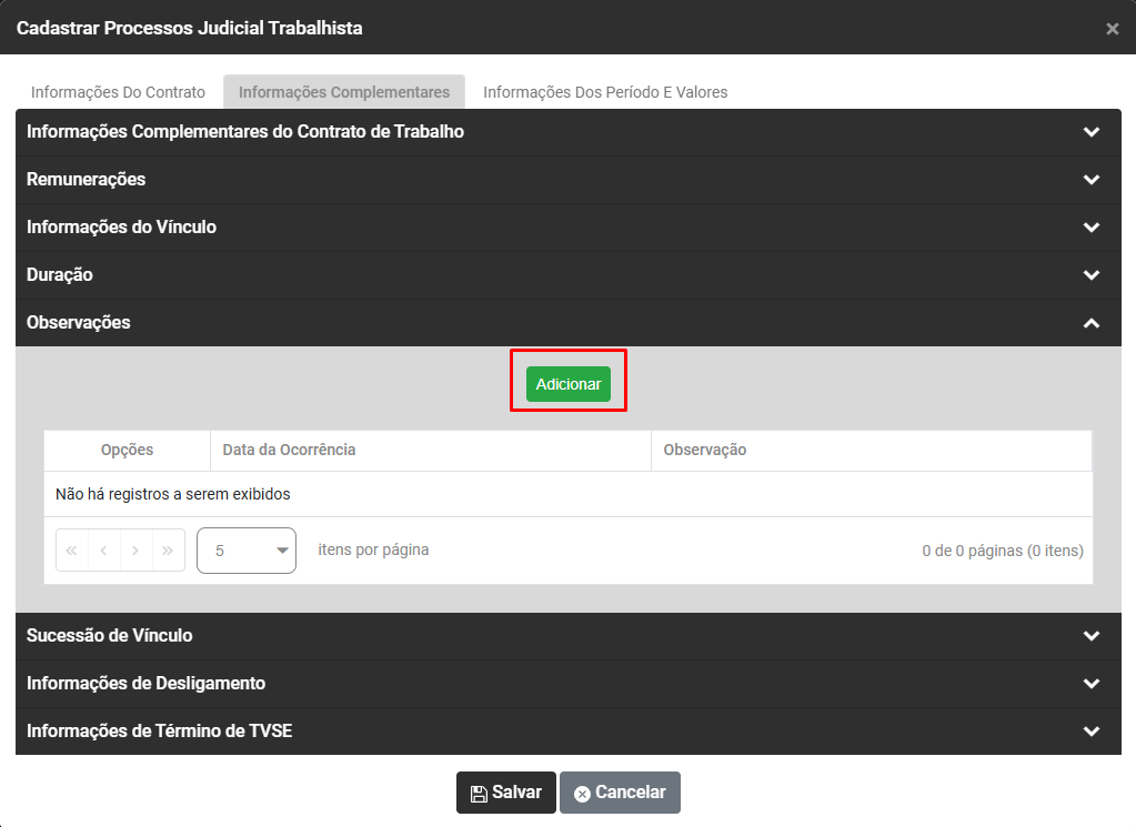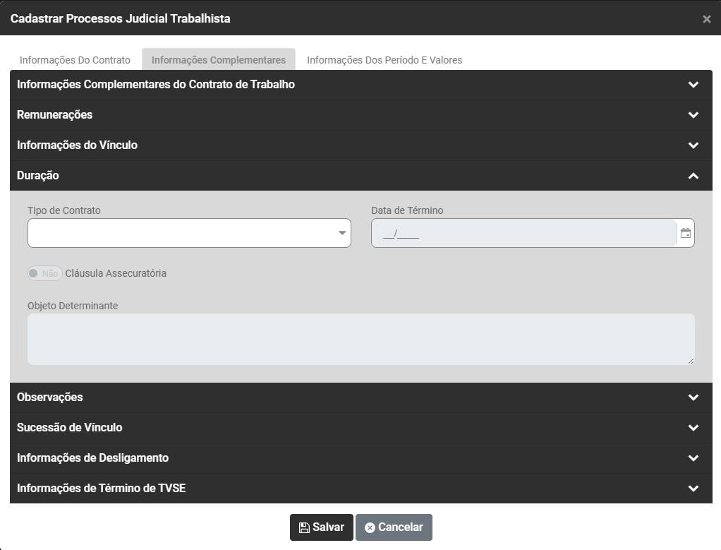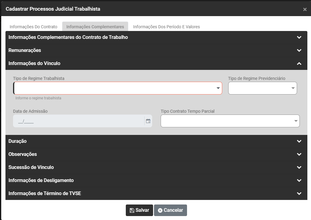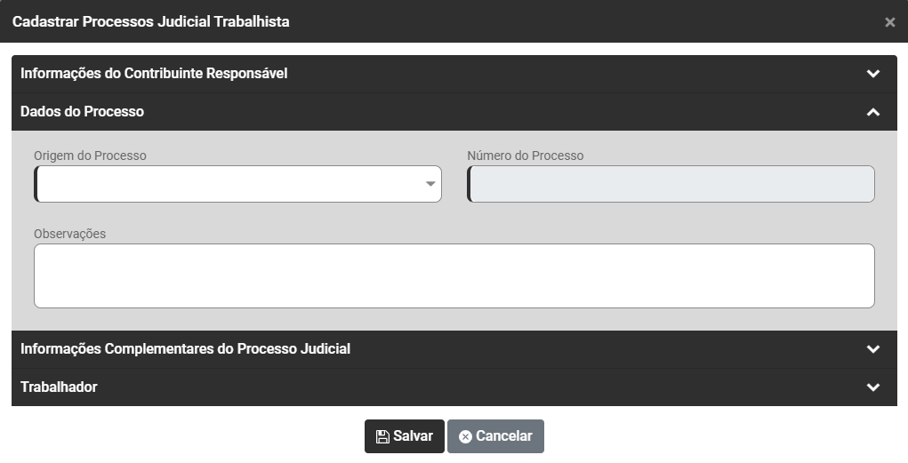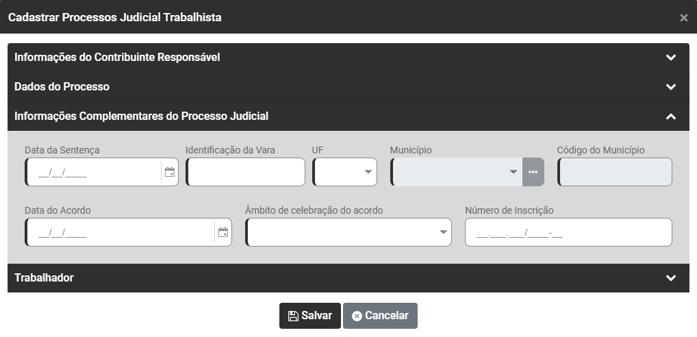 Ao acessar o botão Adicionar será apresentada a tela para cadastro do Processo Trabalhista, com as seguintes informações para serem cadastradas: