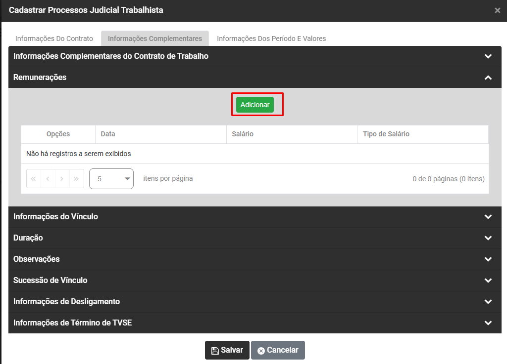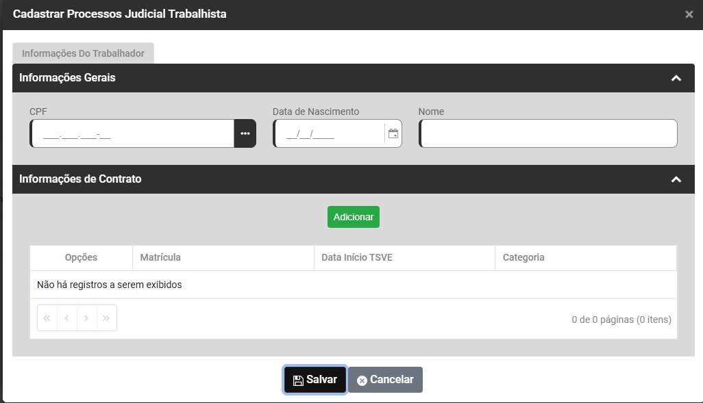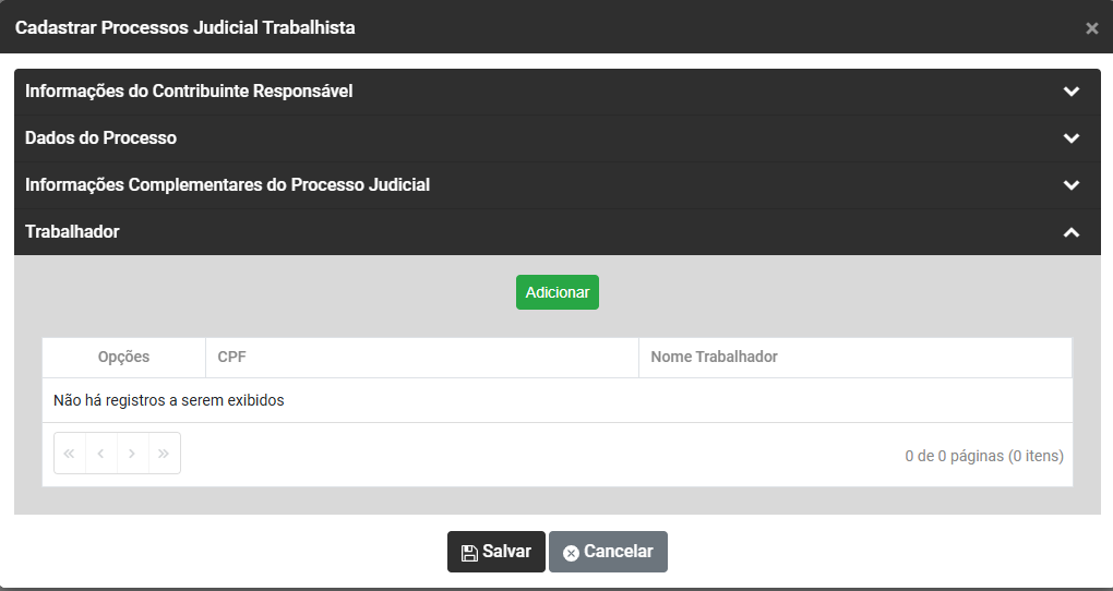Clique no botão Adicionar para informar os Trabalhadores relacionados ao Processo Trabalhista que está sendo cadastrado, informe