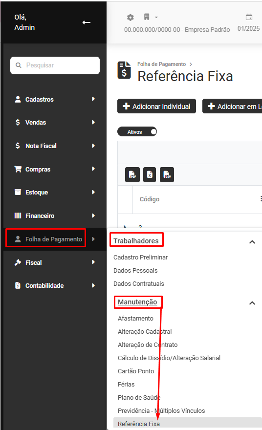 Para Cadastrar as Referências Fixas do Trabalhadores você deverá acessar o menu Folha de Pagamento>Trabalhadores>Manutenção>Referência Fixa