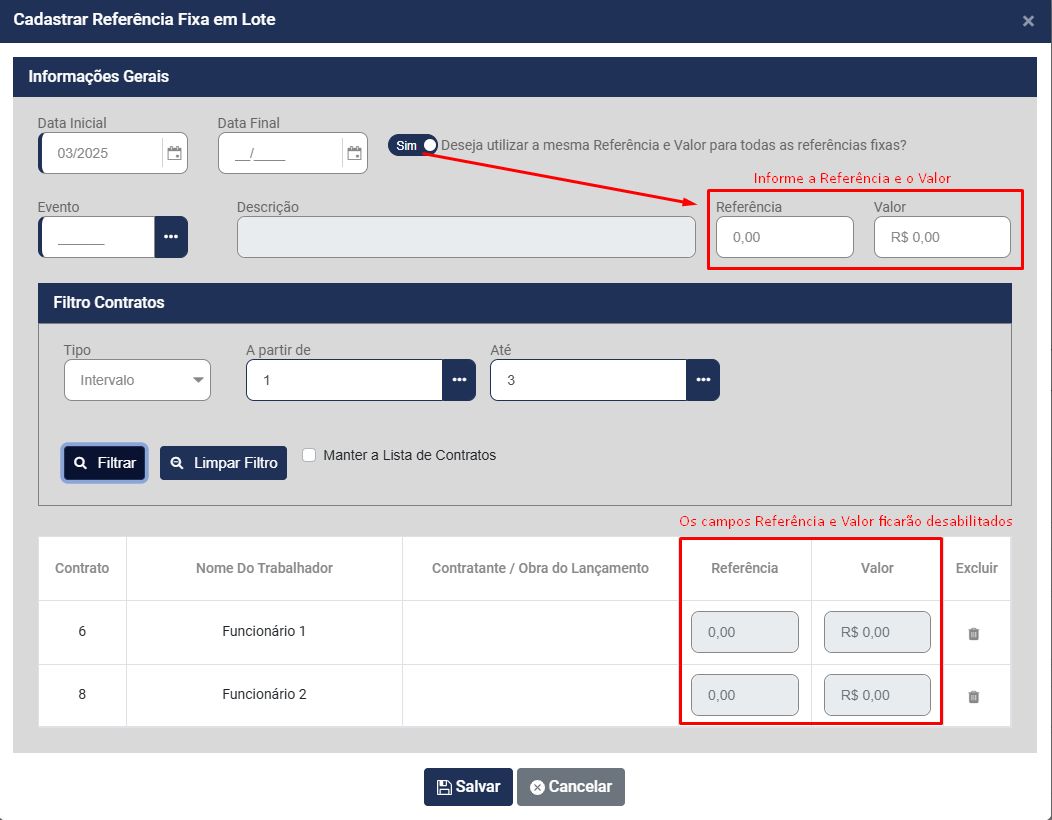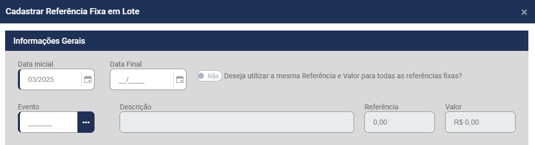 Ao clicar no botão Adicionar em Lote o Módulo apresentará a tela para que você cadastre a Referência Fixa para diversos trabalhadores simultaneamente, informe