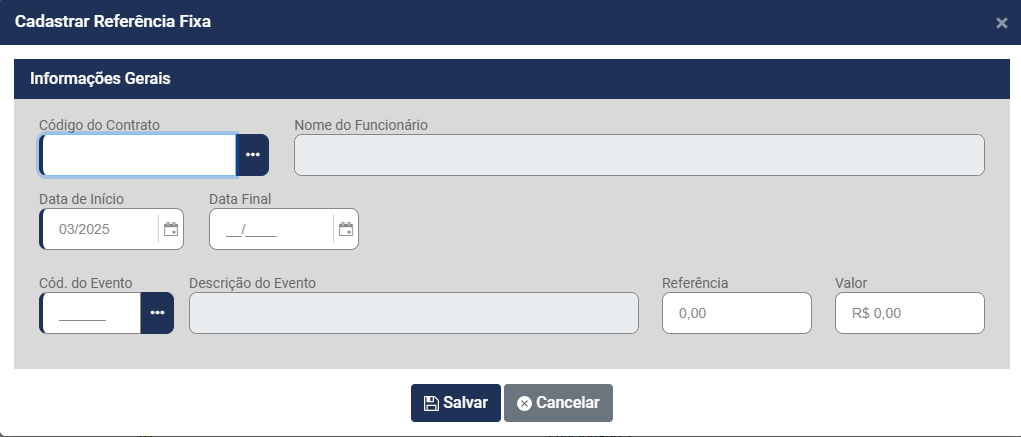 Ao clicar no botão Adicionar Individual o Módulo apresentará a tela para que você cadastre a Referência Fixa para determinado Trabalhador, informe