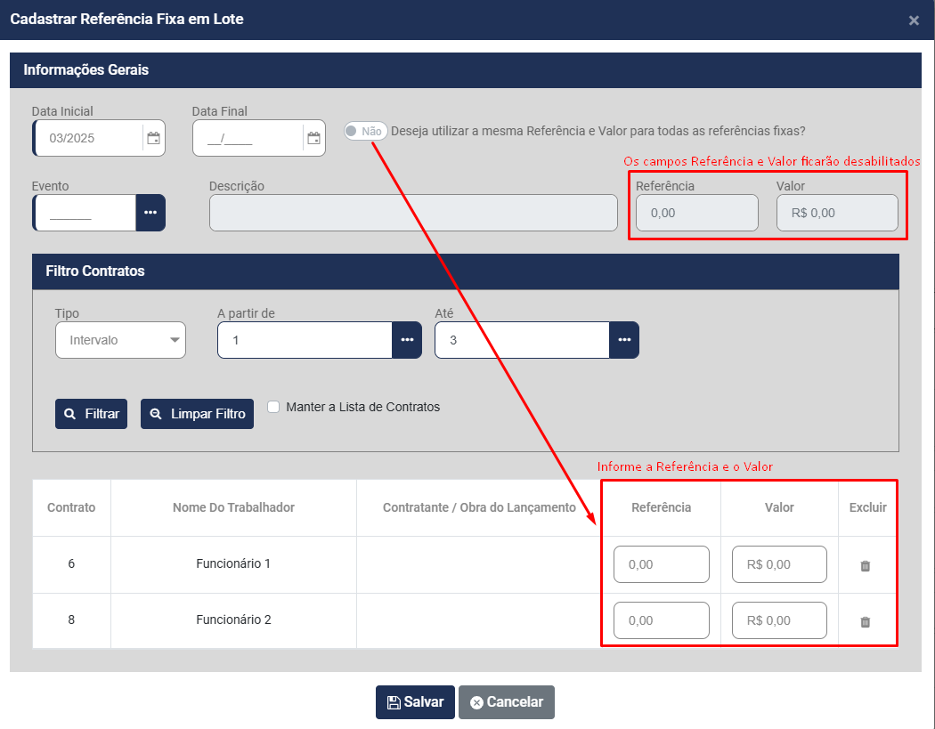 Se você definir Não no campo Deseja utilizar a mesma Referência e Valor para todas as Referências Fixas ? o campo Referência e Valor das informações gerais ficará desabilitado e você irá definir Referência e Valor para cada Trabalhador vinculado a Referência Fixa.