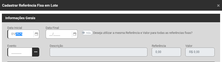 Ao clicar no botão Adicionar em Lote o Módulo apresentará a tela para que você cadastre a Referência Fixa para diversos trabalhadores simultaneamente, informe