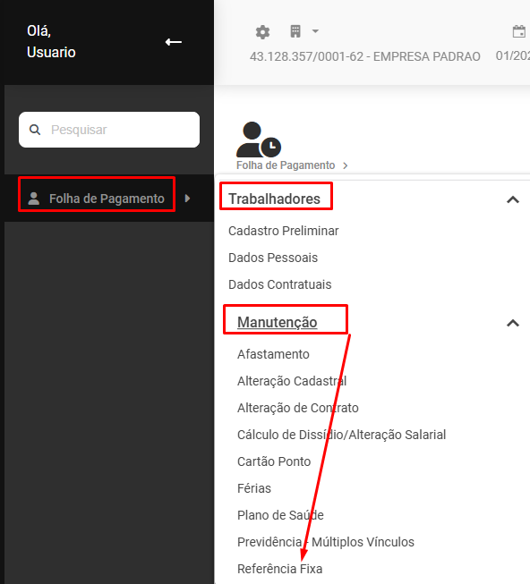 Para que você faça o cadastro da Referência Fixa em Lote acesse o menu Folha de Pagamento>Trabalhadores>Manutenção>Referência Fixa