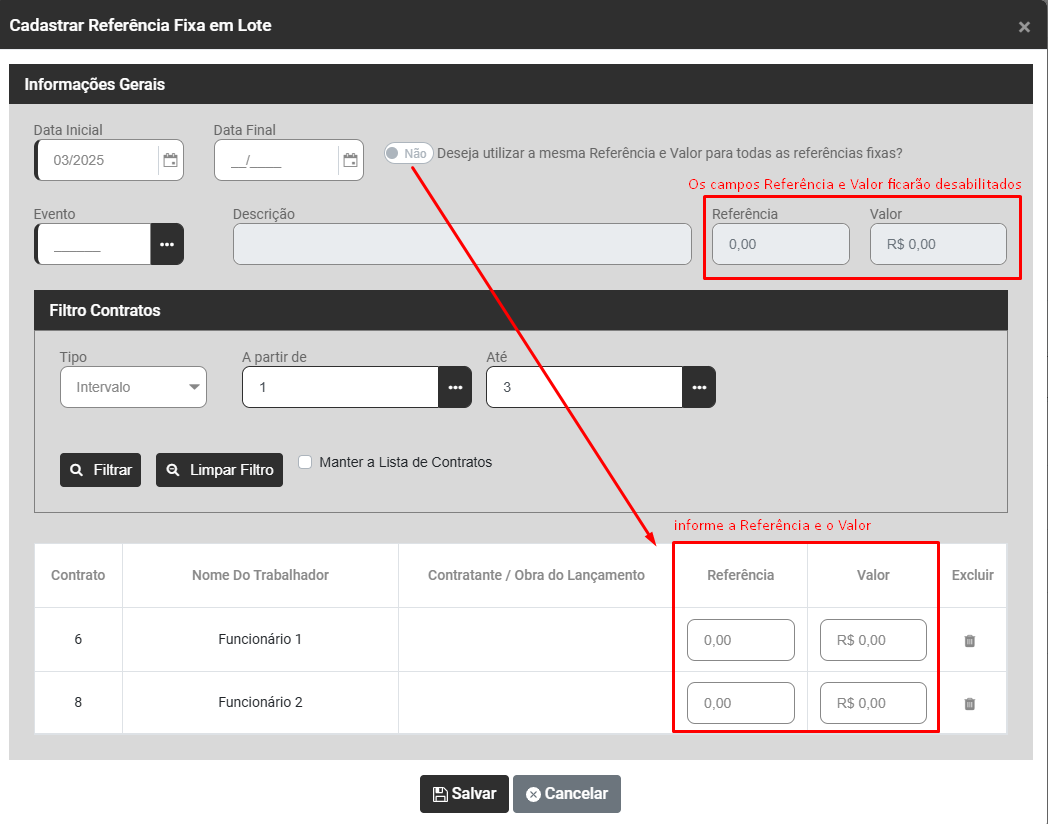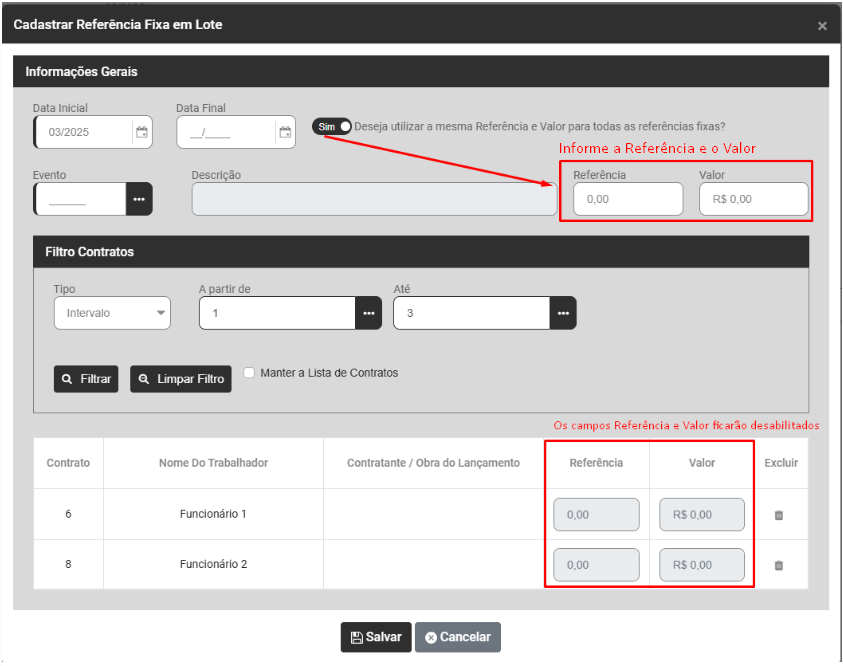 Se você definir Não no campo Deseja utilizar a mesma Referência e Valor para todas as Referências Fixas ? o campo Referência e Valor das informações gerais ficará desabilitado e você irá definir Referência e Valor para cada Trabalhador vinculado a Referência Fixa.