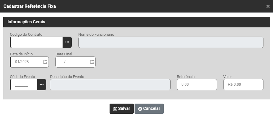 Ao clicar no botão Adicionar Individual o Módulo apresentará a tela para que você cadastre a Referência Fixa para determinado Trabalhador, informe