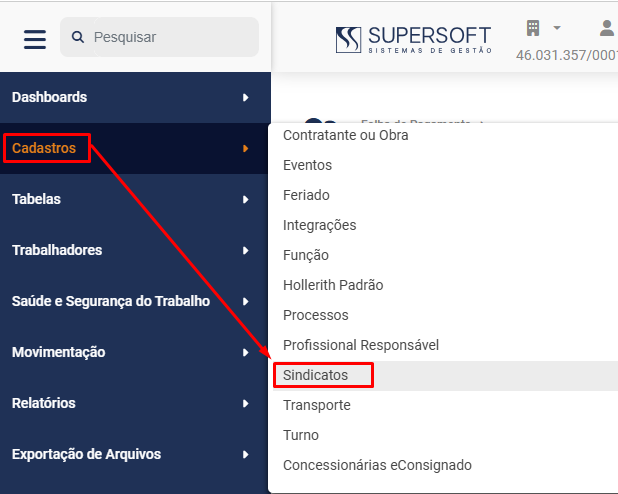 Para cadastrar os Sindicatos você deverá acessar o menu Folha de Pagamento>Cadastros>Sindicatos
