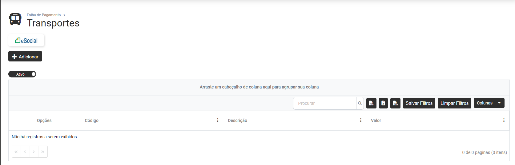 Para cadastrar um novo Transporte, acesse o botão Adicionar