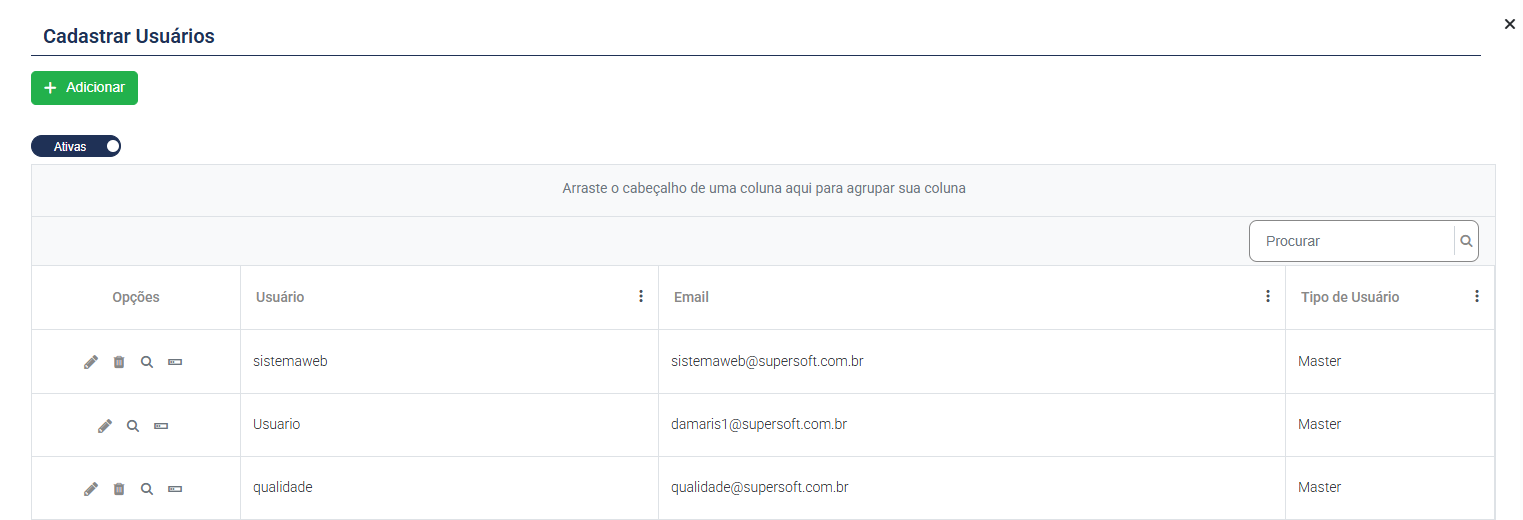Para cadastrar um novo Usuário clique no Botão Adicionar, existente na parte superior da tela