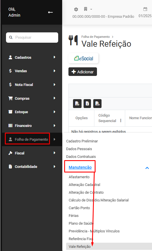 Para cadastrar o Vale Refeição acesse o botão Adicionar, existente na parte superior da tela
