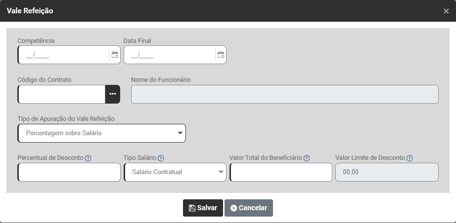 O Módulo apresentará a tela de Cadastro do Vale Refeição, contendo: