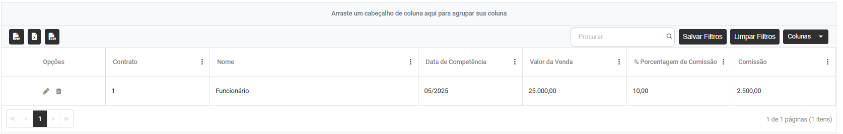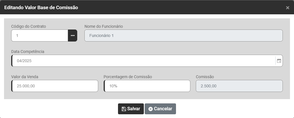 - Porcentagem de Comissão - Se no Contrato do funcionário estiver definida o Sistema trará a informação automaticamente
