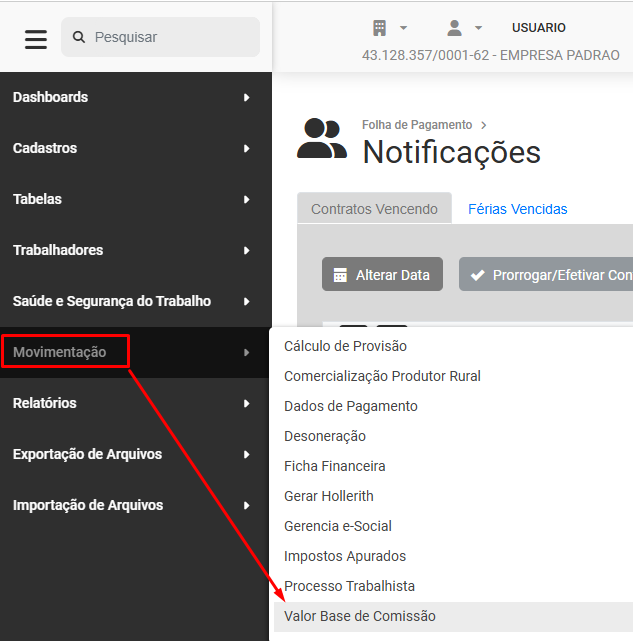 Para cadastrar a Base de Comissão dos Trabalhadores, acesse o menu Folha de Pagamento>Movimentação>Valor Base de Comissão