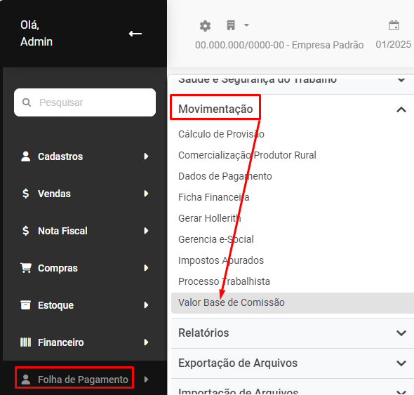 Para cadastrar a Base de Comissão dos Trabalhadores, acesse o menu Folha de Pagamento>Movimentação>Valor Base de Comissão