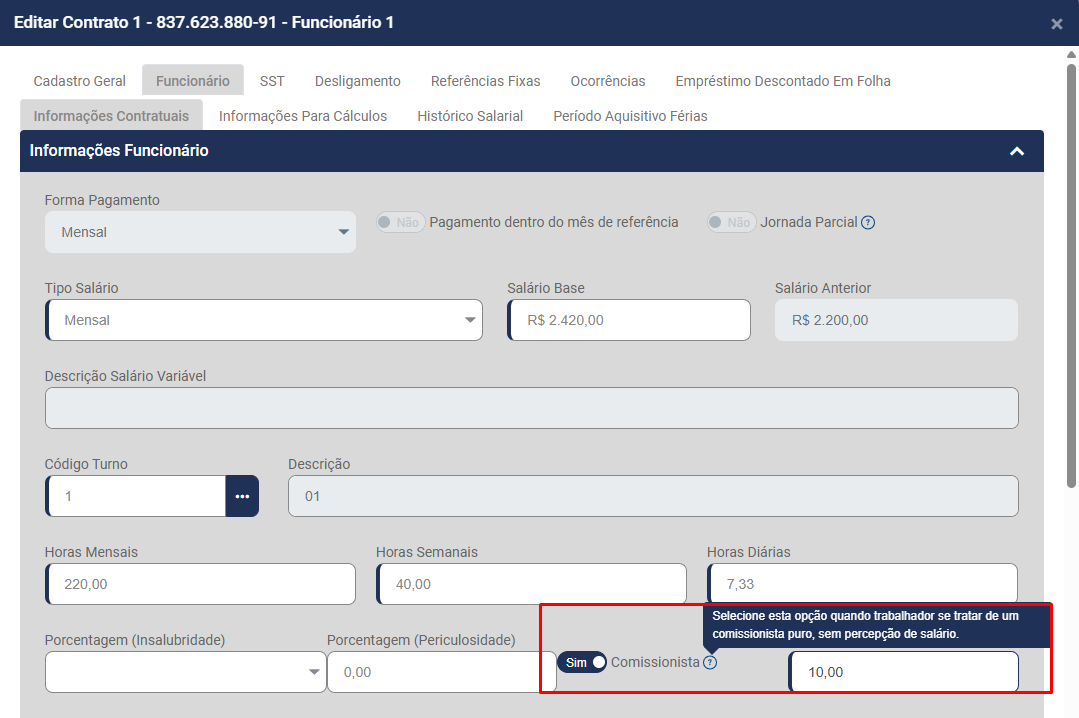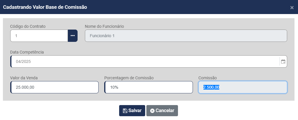 - Porcentagem de Comissão - Se no Contrato do funcionário estiver definida o Sistema trará a informação automaticamente