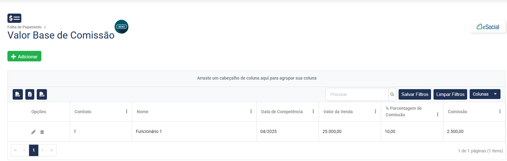 Cadastro do Valor Base de Comissão