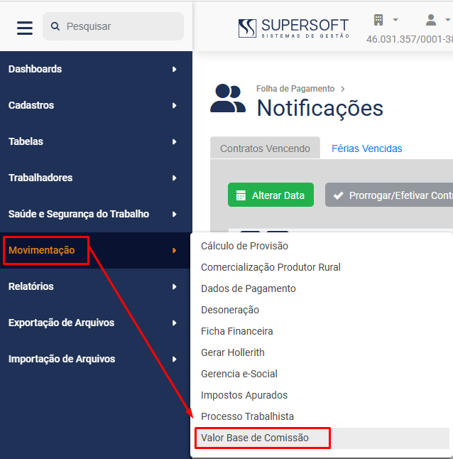 Para cadastrar a Base de Comissão dos Trabalhadores, acesse o menu Folha de Pagamento>Movimentação>Valor Base de Comissão