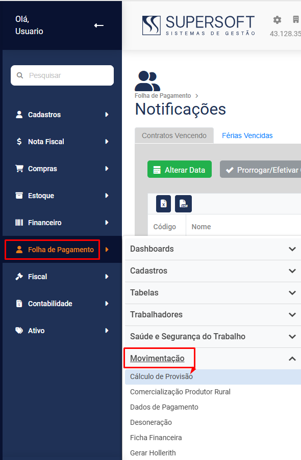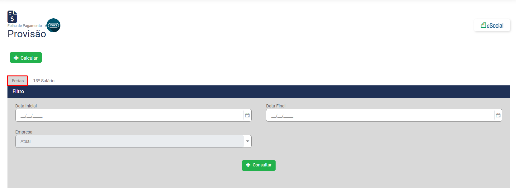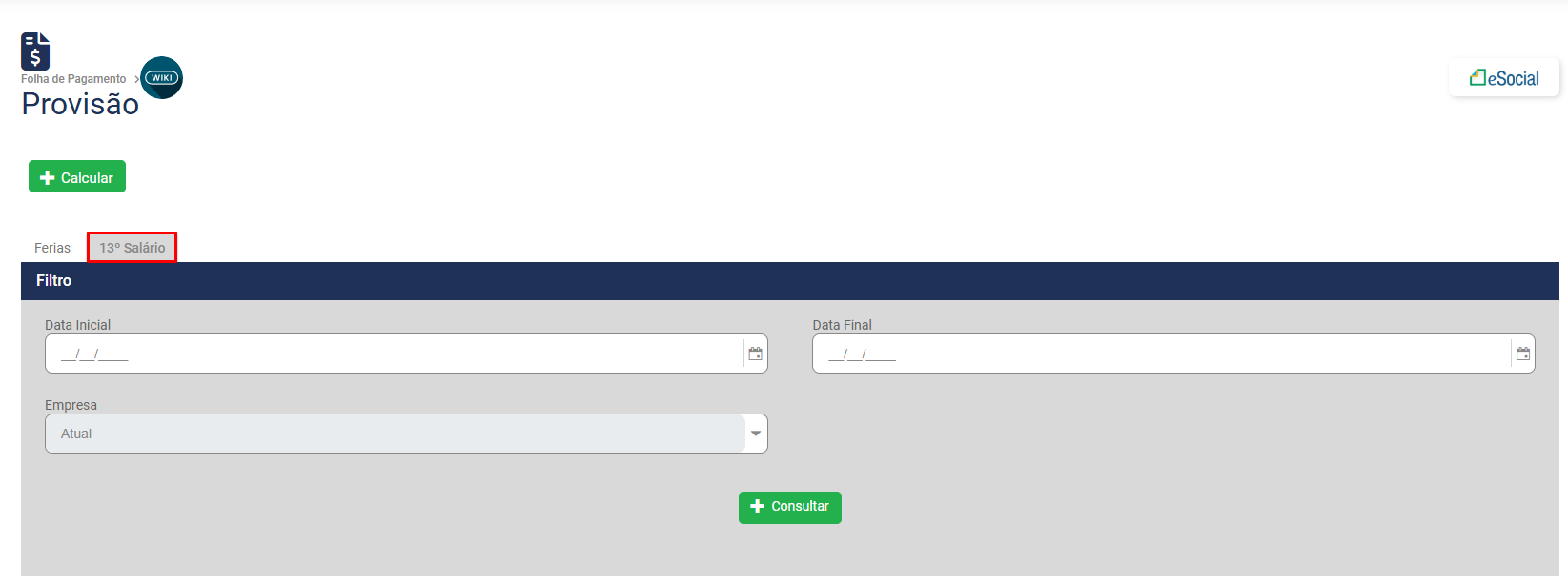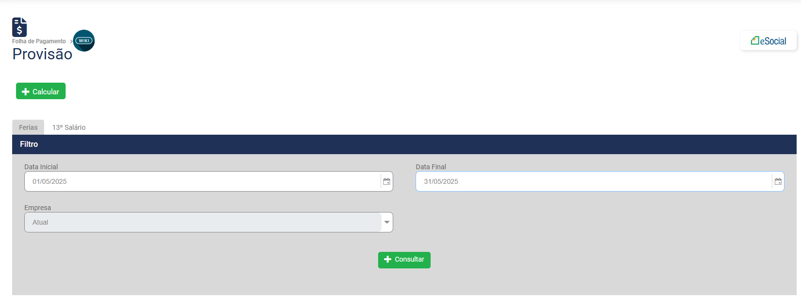 Para realizar o cálculo da Provisão, acesse o botão Calcular na parte superior da Tela