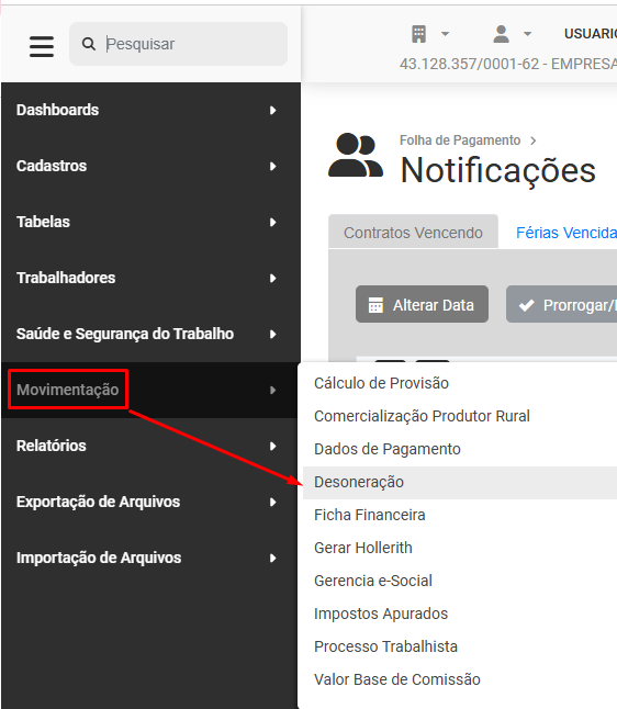 Para cadastrar as informações para geração dos impostos considerando a Desoneração da Empresa você deverá acessar o menu Movimentação>Desoneração