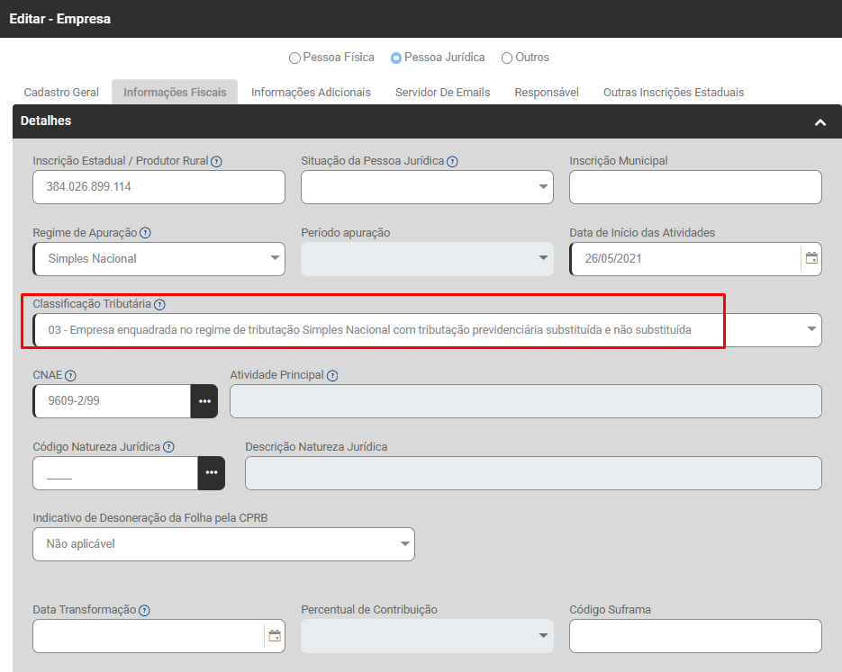 - Classificação Tributária for 03 (Empresa enquadrada no regime de tributação Simples Nacional com tributação previdenciária substituída e não substituída