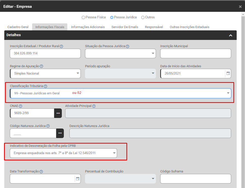 - Classificação Tributária for 02 (Empresa enquadrada no regime de tributação Simples Nacional com tributação previdenciária não substituída ou 99 (Pessoas Jurídicas em Geral) e o campo Indicativo de Desoneração da Folha pela CPRB for Empresa Enquadrada nos artigos 7º e 8º da Lei 12.546/2011