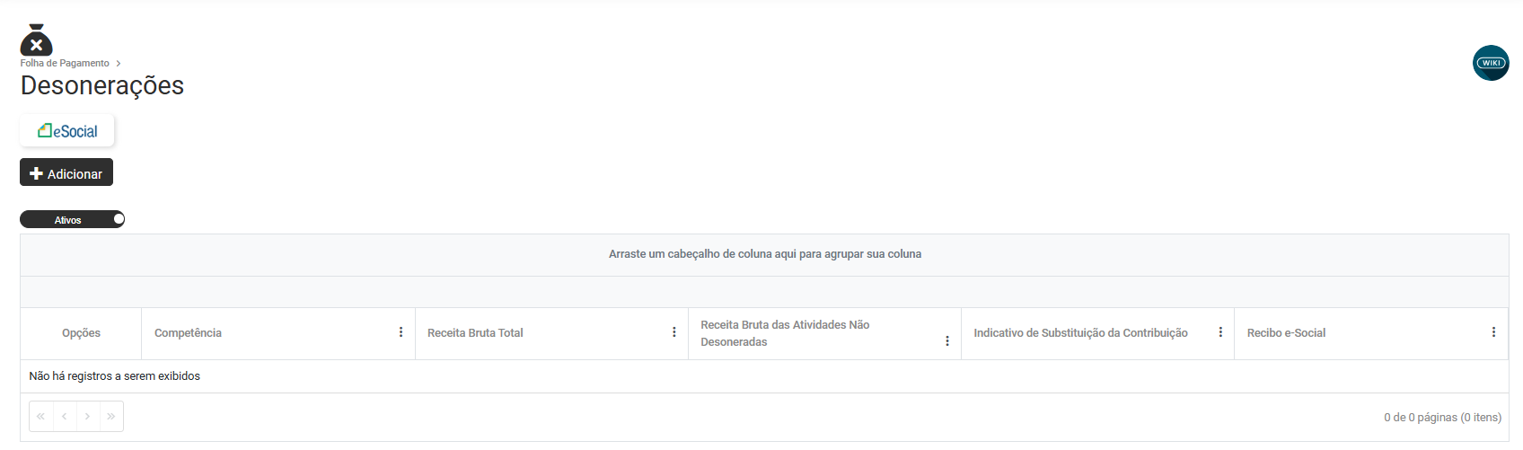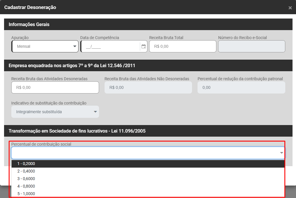 Para cadastrar a Desoneração da Folha de Pagamento acesse o botão "Adicionar" será aberta a tela para Cadastrar Desoneração, informe:
