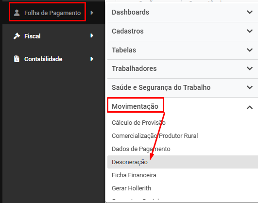 Será habilitado o menu Folha de Pagamento>Movimentação>Desoneração