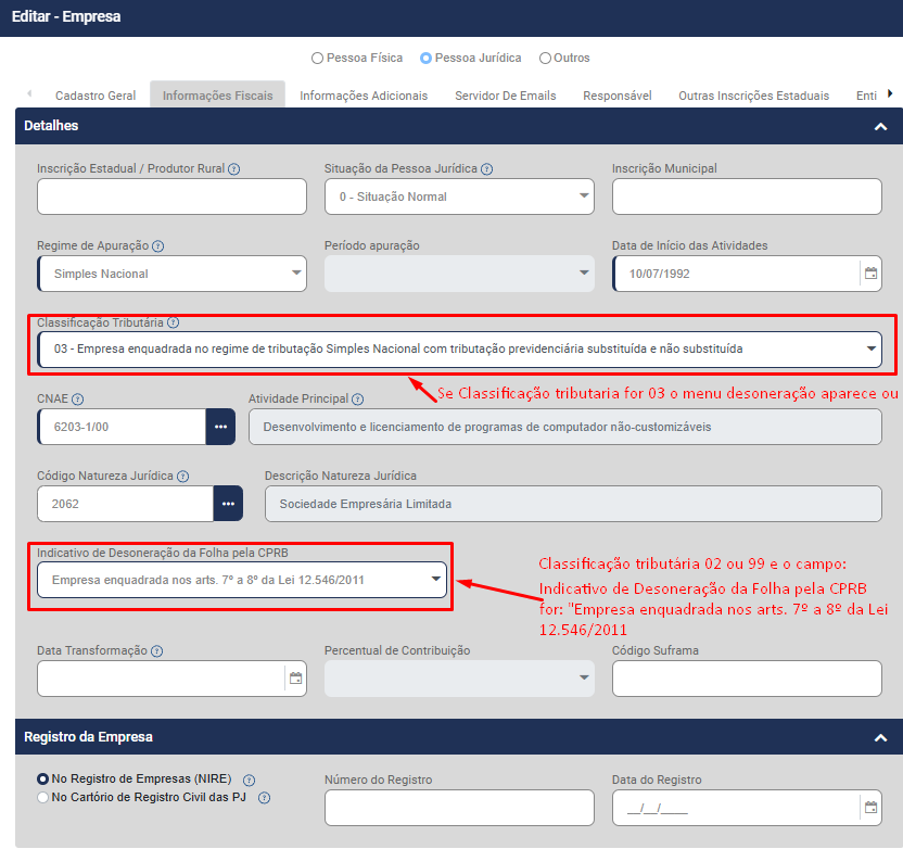 • Classificação Tributária for 02 (Empresa enquadrada no regime de tributação Simples Nacional com tributação previdenciária não substituída ou 99 (Pessoas Jurídicas em Geral) e o campo Indicativo de Desoneração da Folha pela CPRB for Empresa Enquadrada nos artigos 7º e 8º da Lei 12.546/2011