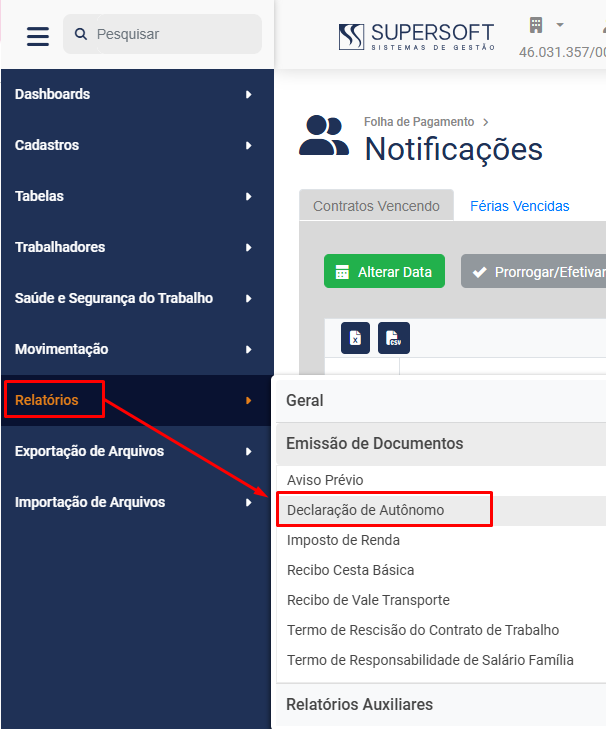 Para que você imprima a Declaração de Autônomo deverá acessar o menu Folha de Pagamento>Relatório>Emissão de Documentos>Declaração de Autônomo