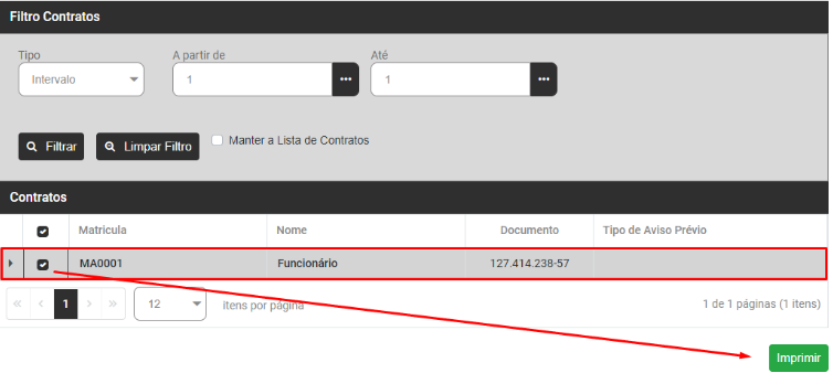 Clique em Filtrar e o Módulo apresentará na parte inferior da tela os dados do funcionário que teve seu contrato filtrado anteriormente, selecione o funcionário e clique em Imprimir
