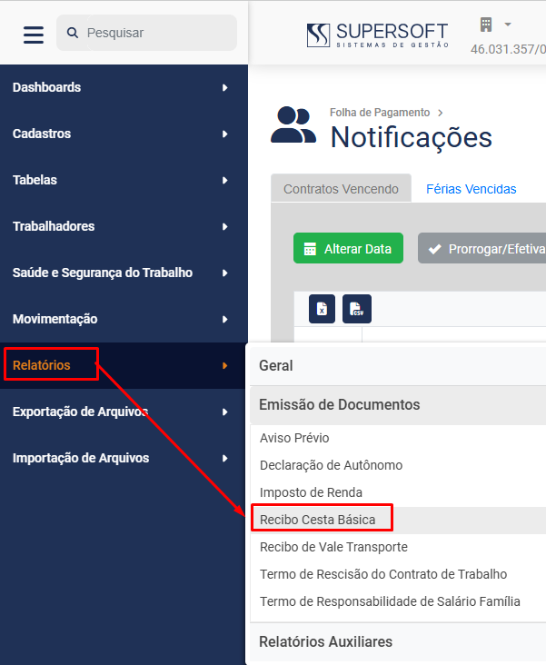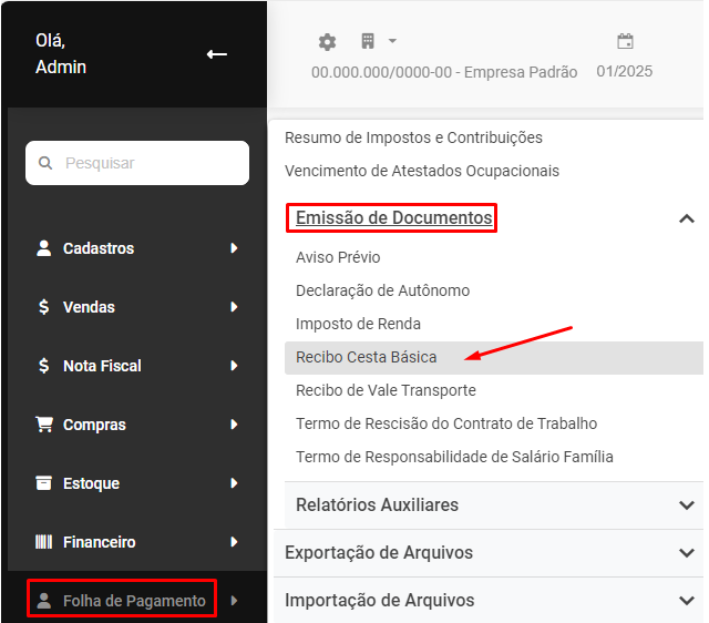Para impressão do Recibo de Cesta Básica acesse o menu Folha de Pagamento>Relatórios>Emissão de documentos>Recibo Cesta Básica