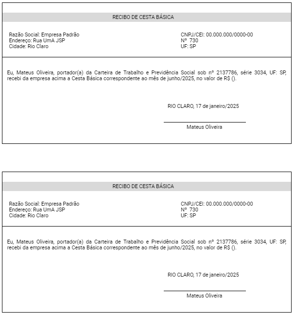 O Módulo fará a impressão do Recibo de Cesta Básica