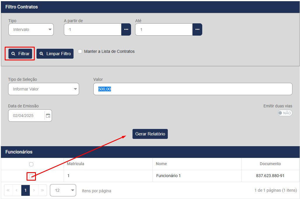 Ao clicar em filtrar o Módulo apresentará a relação de trabalhadores filtrados, selecione o trabalhador e clique no botão Gerar Relatório